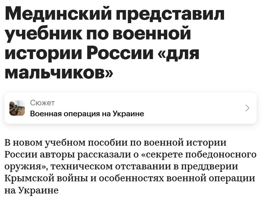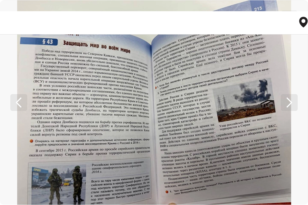 «За их спиной вся Россия, в которую теперь входят ДНР, ЛНР, Запорожская и Херсонская области, их семьи, родственники, весь российский народ. А перед ними — зомбированный антирусской пропагандой противник, убивающий мирных жителей и пленных», — говорится в учебнике.