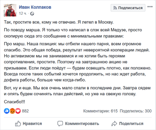 Колпаков тут разразился в FB программным заявлением. Мне одному кажется, что это все как-то предельно мерзенько выглядит? Они отбили. Всем спасибо, все свободны. Но активизмом они не занимаются. На акцию не призывают.