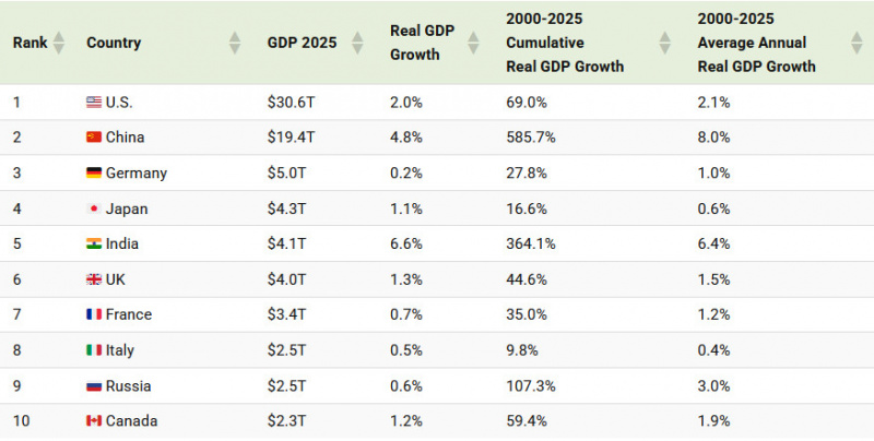 Инфографика, созданная специалистами портала Visual Capitalist, отражает состояние мировой экономики в 2025 году и основана на прогнозах последнего выпуска World Economic Outlook Международного валютного фонда.