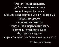 «Россия - самая паскудная, до блевоты мерзкая страна во всей мировой истории. Методом селекции там вывели чудовищных моральных уродов, у которых само понятие Добра и Зла вывернуто на изнанку. Всю свою историю эта нация барахтается в дерьме и при этом желает потопить в нем весь мир...» – И.А.Ильин (1882-1954) , русский философ