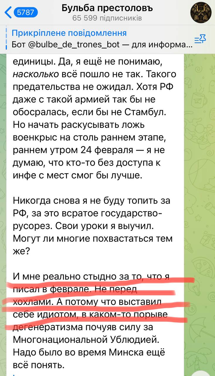 Это не прозрение. Это попытка переобуться и сохранить кусок своей шкуры. Весь текст сквозит презрением к Украине и сожалением того, что РФ не смогла реализовать имперские амбиции этого тела.