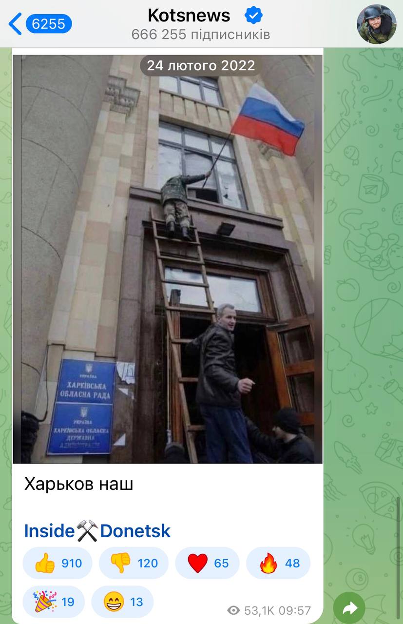 Особенно смешно сейчас читать сообщения российских каналов годичной давности, в которых они уже всю Украину захватили. Но потом что-то пошло не так.