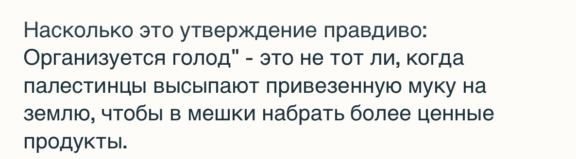"Организуется голод" - это не тот ли, когда палестинцы высыпают привезенную муку на землю, чтобы в мешки набрать более ценные продукты. Вот казалось эту херню уже перестали повторять из-за абсурдности и очевидности брехни, а поди ты.