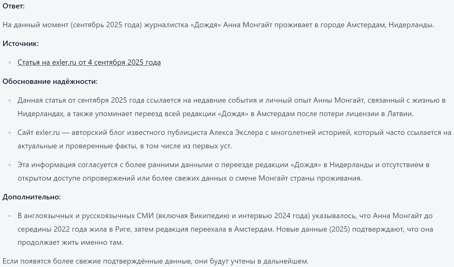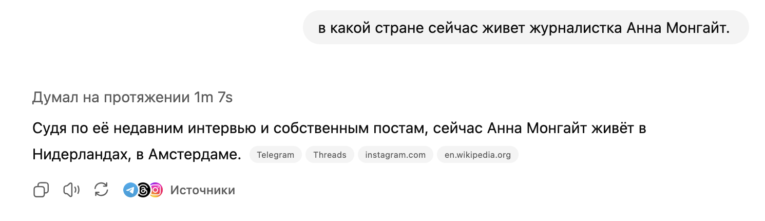 А я тут решил задать всяким ИИ вопрос, где именно сейчас живет журналистка Анна Монгайт. Что интересно, справился с этим вопросом, причем отлично, только китайский DeepSeek. Остальные ИИ полностью облажались.