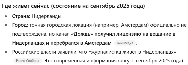 .🚨 Текущий статус: Хотя точный город её нынешнего проживания в результатах поиска прямо не указан, последние упоминания (на середину 2025 года) связывают её деятельность с телеканалом «Дождь», который теперь базируется в Нидерландах. При этом известно, что она продолжает активно работать, в том числе брать интервью и вести программы