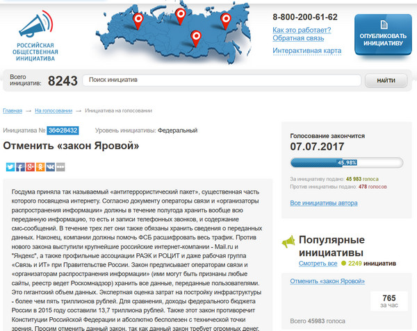 Поэтому давайте попробуем - вот петиция за отмену этого абсолютно вредительского и совершенно антиконституционного закона. Там уже под пятьдесят тысяч голосов, я уверен, что мы с легкостью наберем там требуемые сто тысяч. Я почти уверен, что они и на сто тысяч голосов положат с большим прибором, как они положили на объяснения всех специалистов о том, что подобный закон принимать совершенно невозможно, но хотя бы попытаемся.