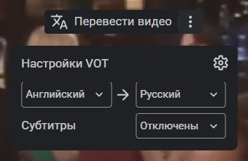 После этого перезагрузите Chrome, и теперь при воспроизведении ролика в YouTube при наведении мышки на ролик будет появляться небольшая панель, в которой можно нажать на три точки меню и выбрать голосовой перевод и/или перевод субтитрами.