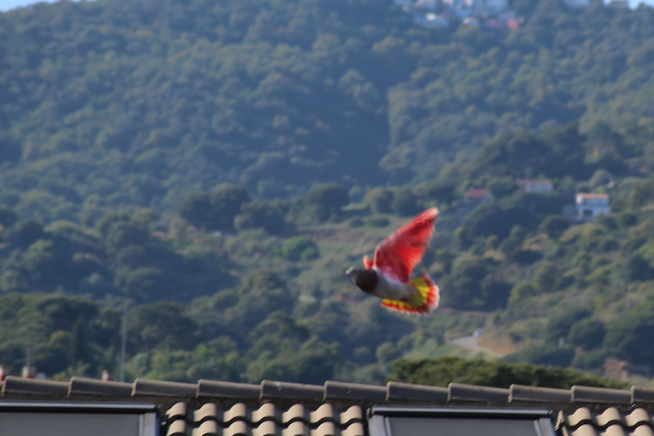 Может это голубь сам перекрасился под попугая.