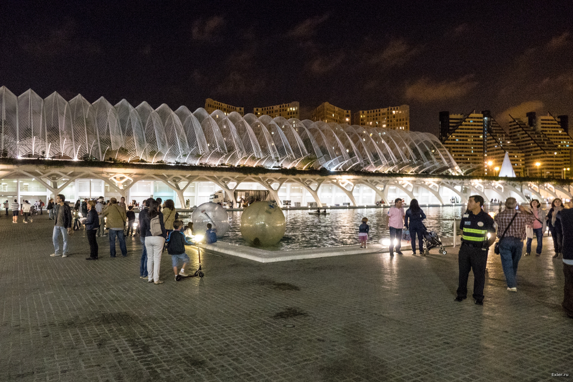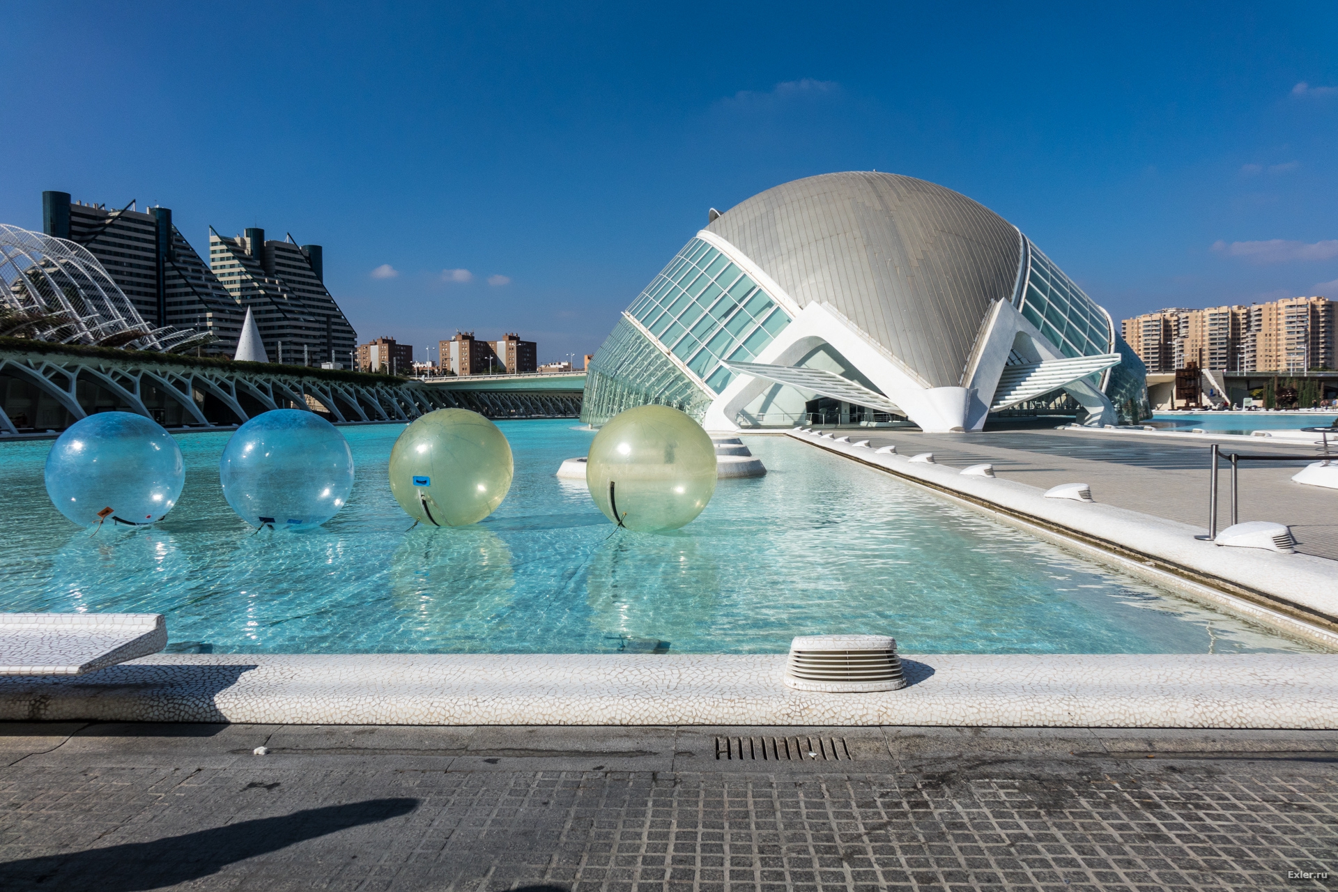 Вид на кинотеатр со стороны научного музея. В этих шарах можно побегать по воде - развлечение такое.