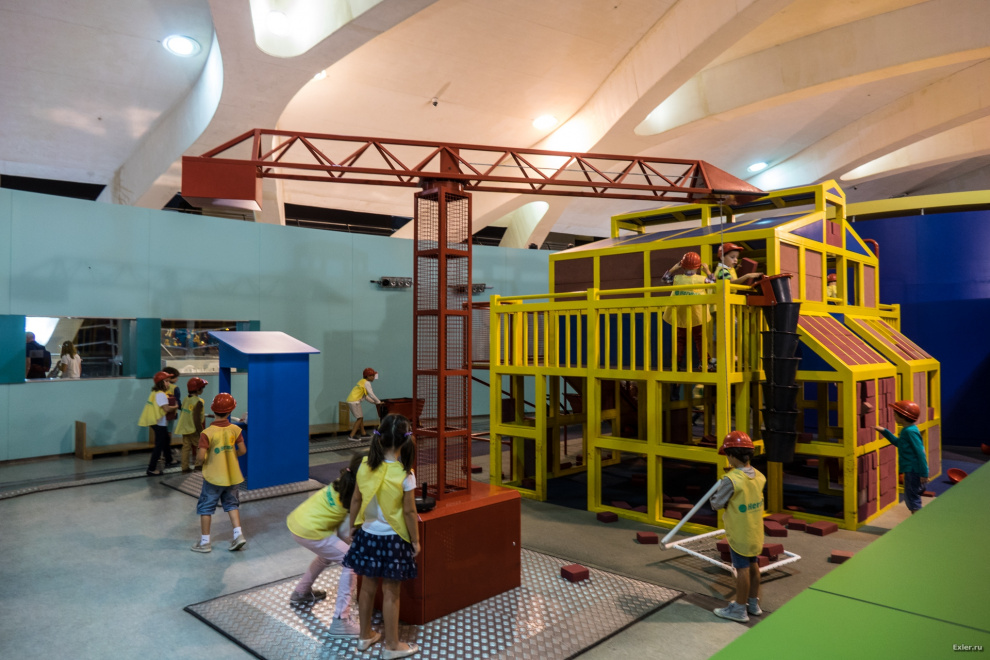 Пошли внутрь - и обалдели. Там практически ничего нет! Пустышка. Огромное здание, состоящее из двух этажей, первый этаж - совершенно пустой, там есть только гардероб и одна кафешка. Чтобы пройти на второй этаж - нужно взять билеты. Взяли билеты, прошли на второй этаж - а там также почти ничего нет. Пара-тройка каких-то достаточно убогих стендов и единственное, что заслуживает внимания - это вот такой аттракцион для детишек, где они могут что-то строить, управлять краном, подачей "кирпичей" и так далее. Мой ребенок был в восторге. Но больше там практически ничего нет. Причем на весь второй здоровенный этаж - ни одного туалета. Ребянок запросился в туалет - пришлось спускаться на первый этаж, где в дальнем углу обнаружилось заведение, рассчитанное на посещение человек пятидесяти. Там было очень одиноко и страшно.
