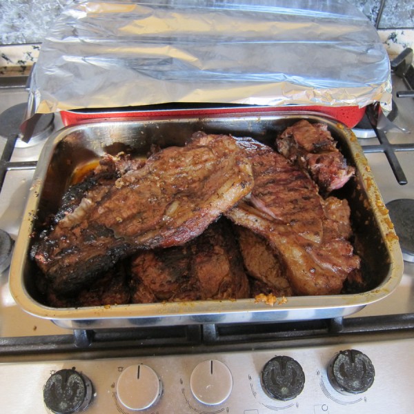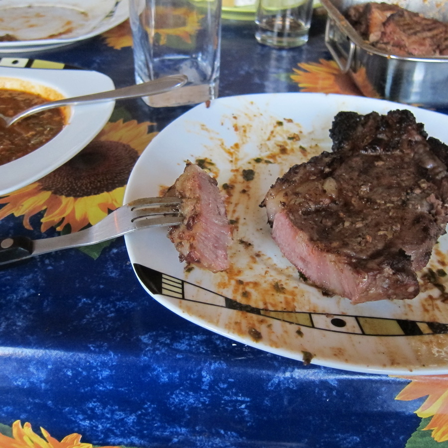 Теперь можно кющать. Баранинка получилась очень славная, но все-таки гвоздь программы - стейки. Очень вкусные и прожарка получилась - вот просто именно так, как надо!