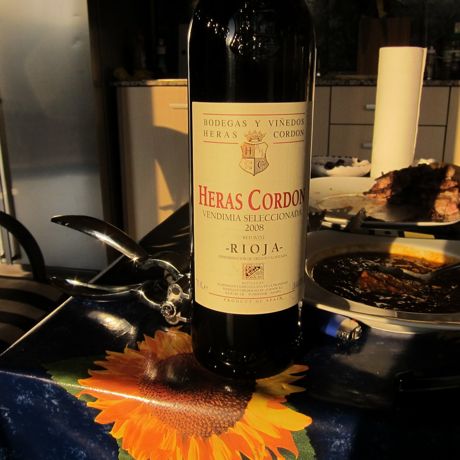 К мясу берем нашу любимую риоху - Heras Cordon. Вино изумительное, но там бодега маленькая, они за границу его не поставляют, так что купить можно только на месте. Стоит 10 евро бутылка. Наши жены это вино тоже любят, хотя временами и говорят: "Опять вы, ребята, нахерасились".