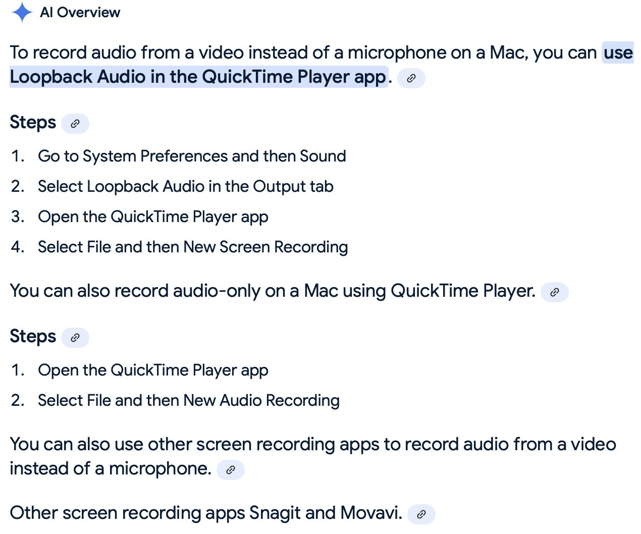 AI Гугла дает такой ответ (см. скриншот), но мне нужна запись видео не только в QuickTime.