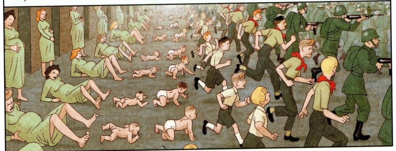 Воспитатели детского сада в Екатеринбурге заставили детей разыграть сценку, в которой мать получает "похоронку" на сына. Ну а что - предусмотрительно, да. Рожать Пыня велит как можно раньше, дальше сына отдавать на лето в военный лагерь, во время учебы - штоп в "Хренармии" занимался: учился автомат заряжать, гранату кидать и пить чистый спирт, закусывая портянкой.