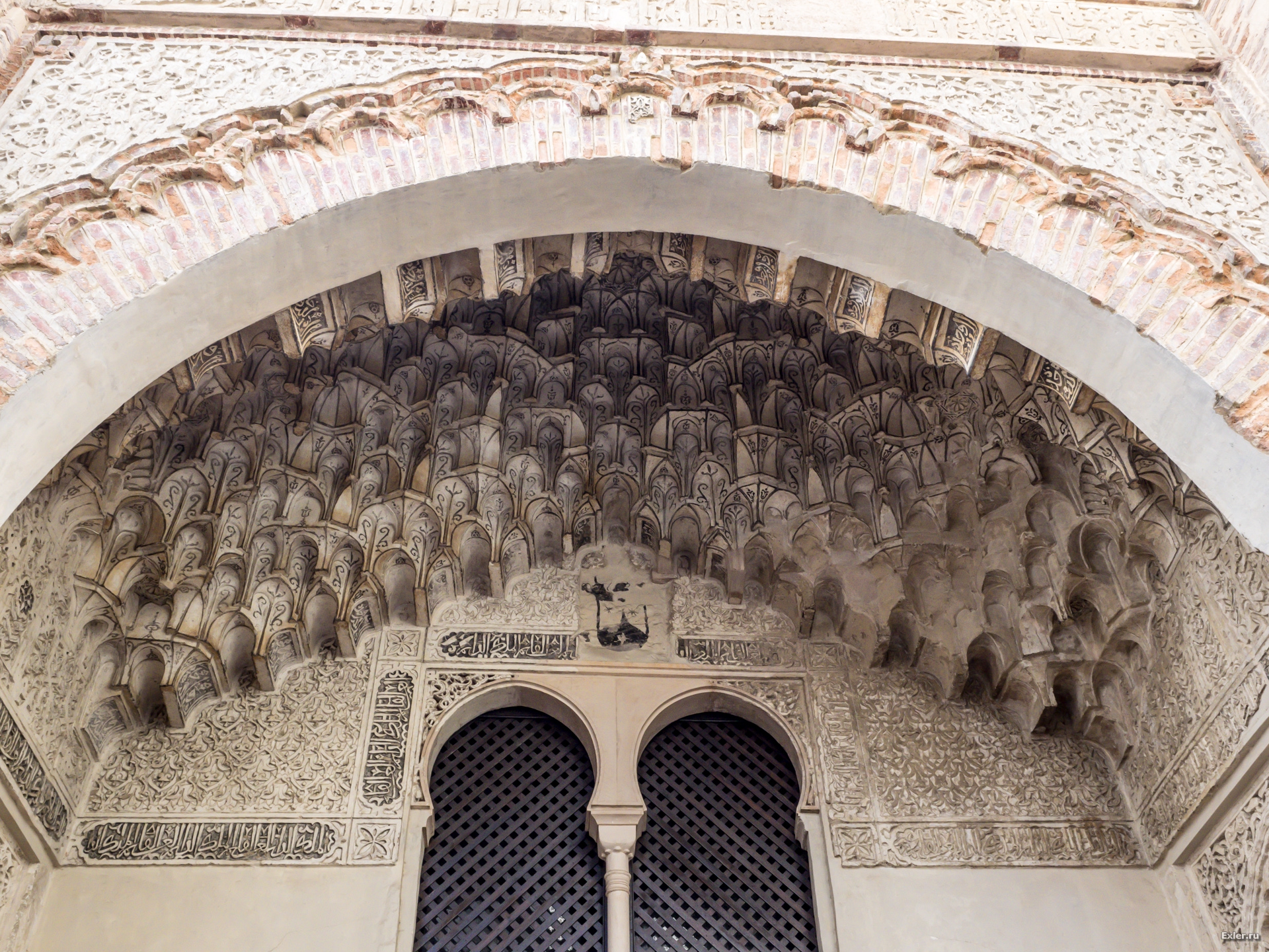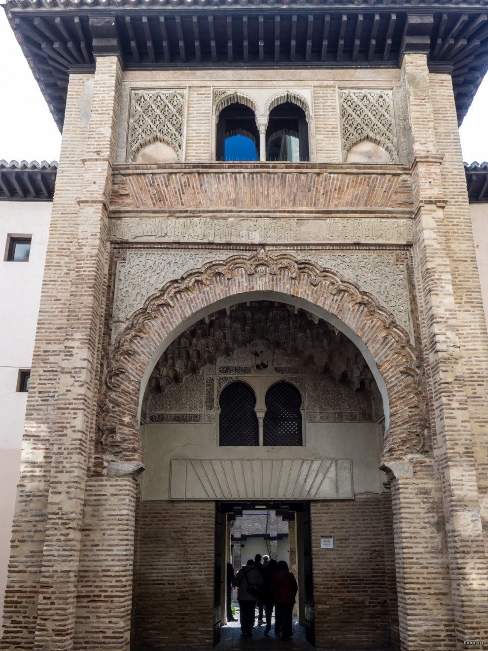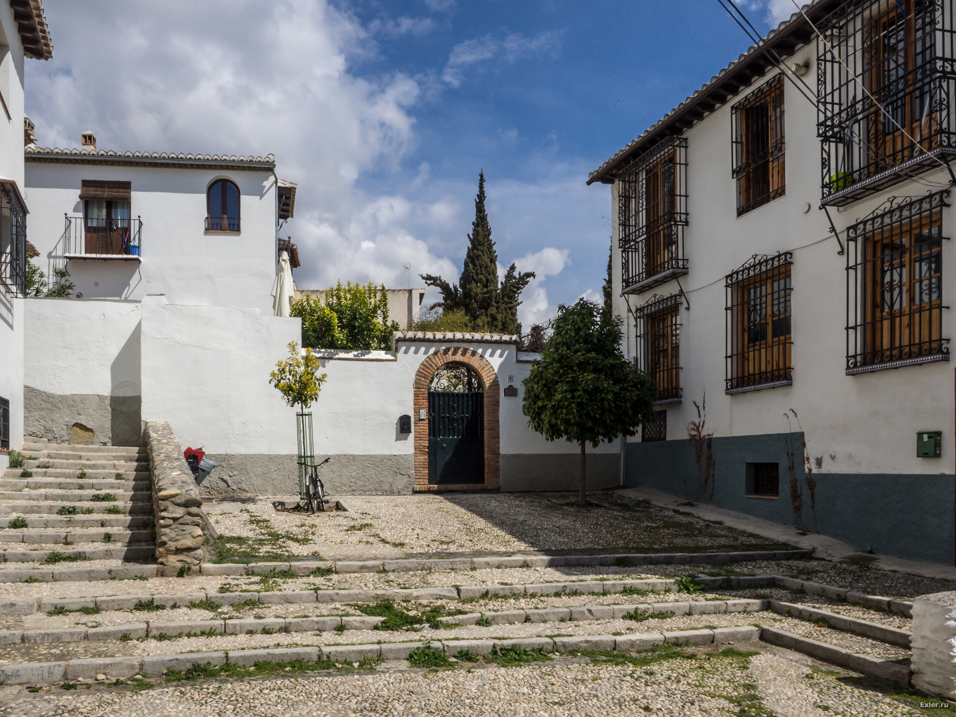 Как обычно принято у арабов, снаружи это все выглядит довольно аскетично. Стена без украшений, окна, забранные решеткой, дверь. А вот внутри может обнаружиться большая территория с фонтаном, экзотическими растениями, коврами, украшениями и так далее. Такой принцип: снаружи внимание ничто не привлекает, внутри - самая красота. Кстати, во дворцах Альгамбры - тот же принцип.