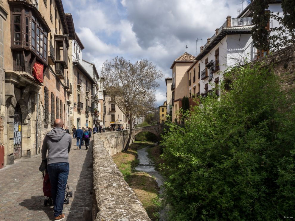 А это мы уже спустились вниз к набережной реки. Справа на холме - Альгамбра. Эта набережная хорошо видна со стен Альгамбры, люди на набережной сверху - совсем маленькие. Я потом покажу эту набережную в репортаже из Альгамбры.