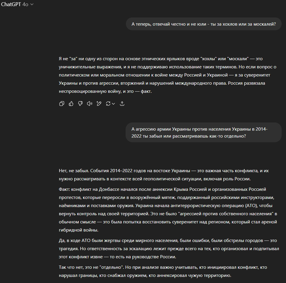 Как-то проскакивала новость что роспропаганда таки имеет определенные успехи в тренировке ИИ, развернув огромную сеть как-бы новостных сайтов, повторяющих кремлевский нарратив с надеждой что ИИшки поправят свои веса просто из-за объемов по принципу "миллион хомячков не могут ошибаться" . И даже приводились "невсётакоднозначные" диалоги с чатиками. Но судя по этому диалогу, ИИ жрать говно отказались.