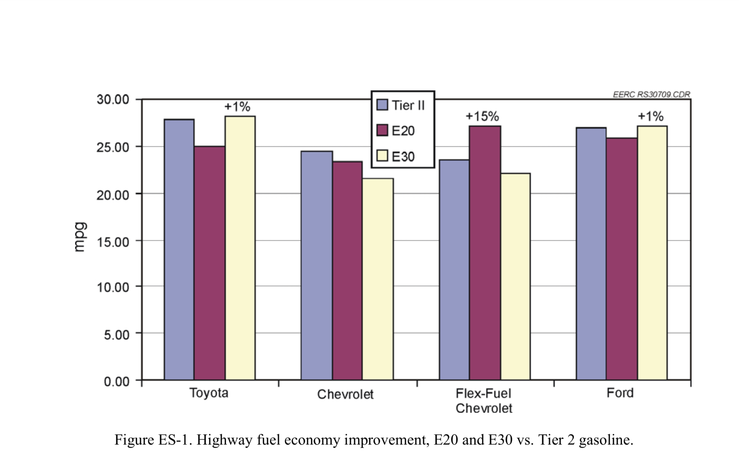 Но это еще не все — у смеси этанола с бензином можно достичь более высоких степеней компрессии, что в современных авто, оснащенных бортовым компьютером и различными датчиками, приводит к более высокой эффективности (большей, чем можно предположить из примитивного подсчета, основанного на BTU — теплоте сгорания топлива).