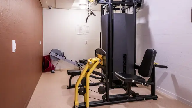 Здесь также есть тренажерный зал с дорогими тренажерами, включая беговую дорожку, пресс для ног и гребной тренажер.