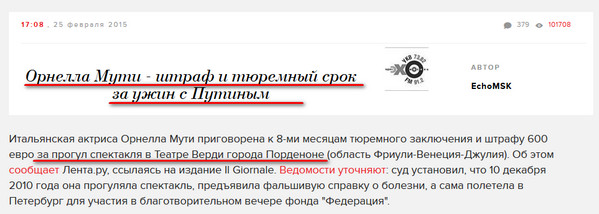 Мало того, посадят-то её не за прогул спектакля, а за мошенничество. Она фальшивую справку о болезни предъявила. Но гораздо бодрее и "шокирующе" смотрятся заголовки про "тюрьму за прогул" или про "тюрьму за Путина".