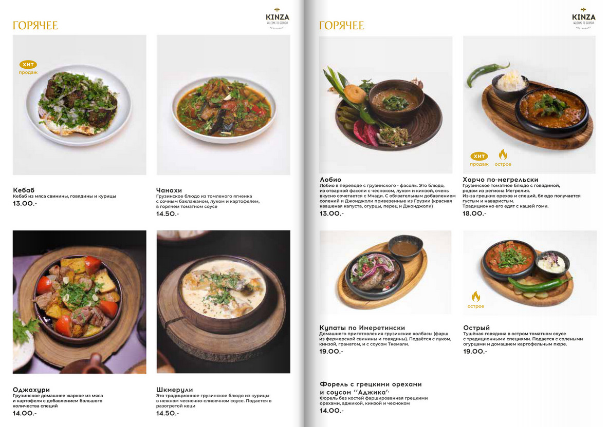 Меню можно посмотреть вот здесь: супы, закуски, салаты, домашняя выпечка (хачапури - царица полей), хинкали, шашлык, горячие блюда, десерты, грузинское вино.