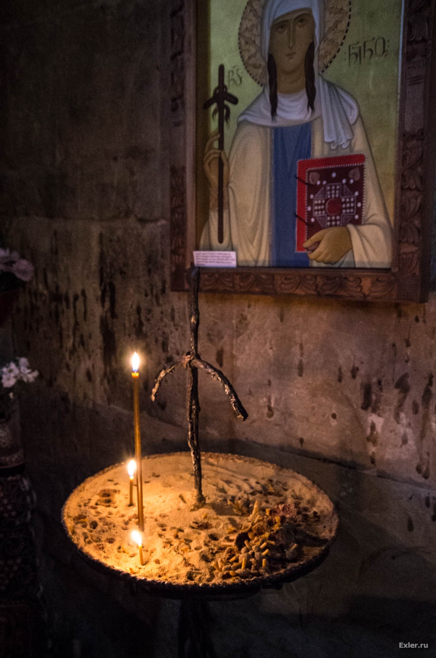 Икона с изображением святой Нины, перед ней - изображение креста из виноградных лоз, связанных ее волосами.