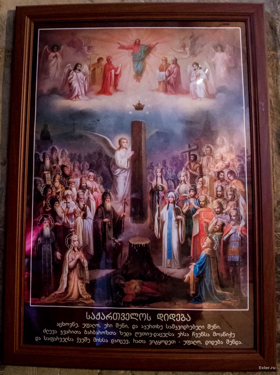 Знаменитая икона "Слава Грузинской Католикосской церкви". Ну, точнее, современная вариация на тему этой иконы, созданной в конце XIX века иконописцем Михаилом Гоброном Сабинашвили. На тему того, кто и что изображено на этой иконе - написаны целые исследования.