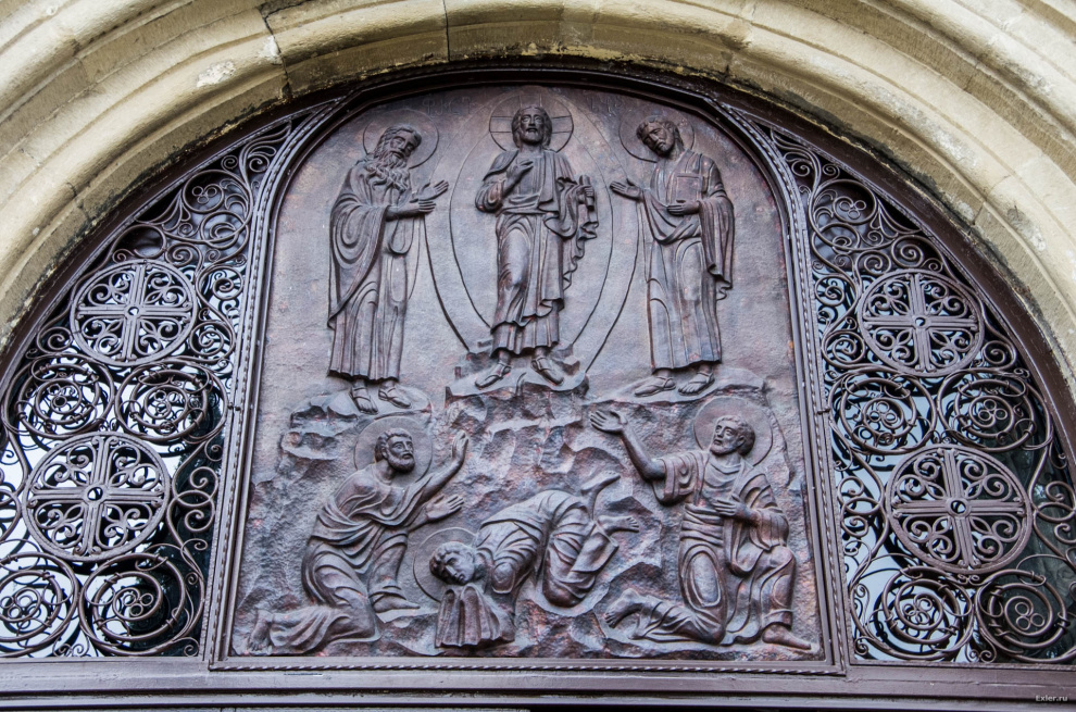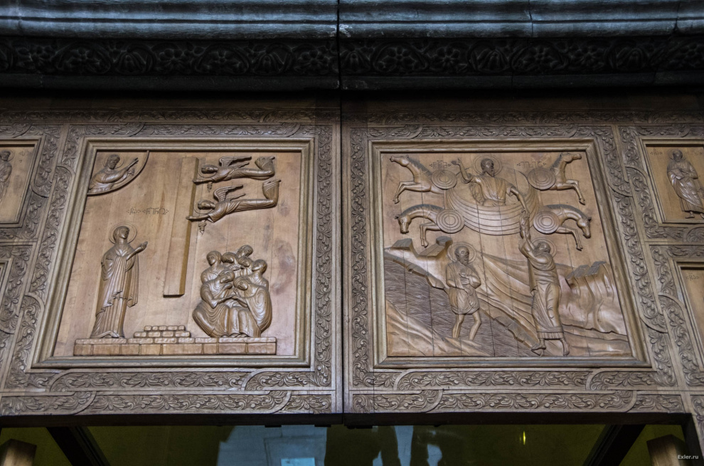 Над одним из входов изображена рука с молотком - это, видимо, "подпись" архитектора нынешнего храма.