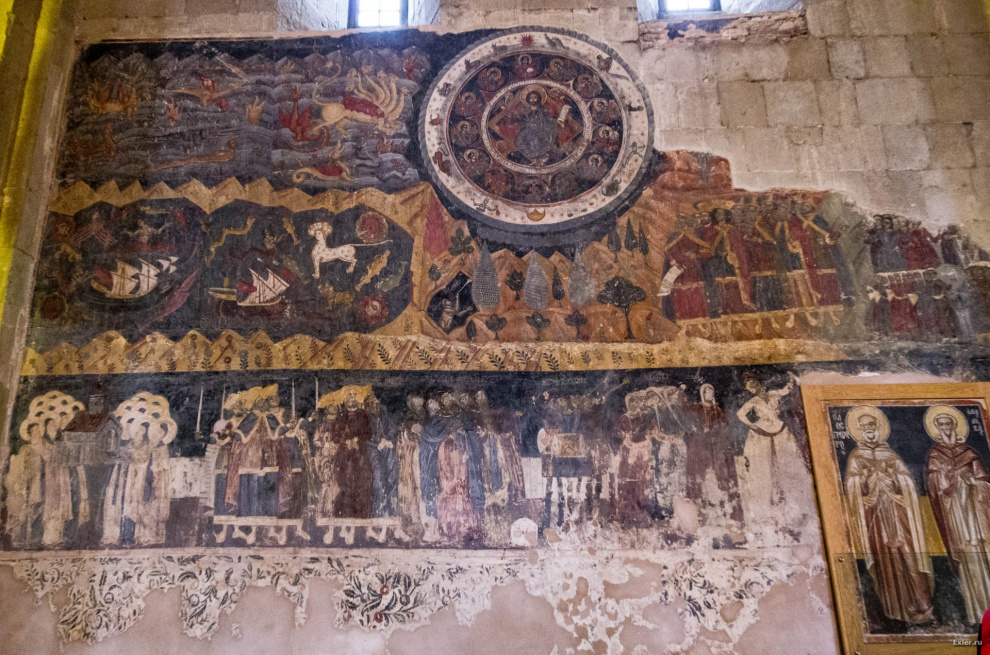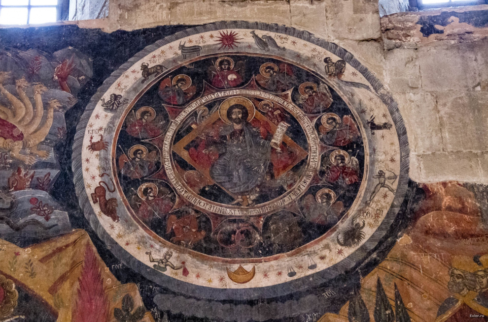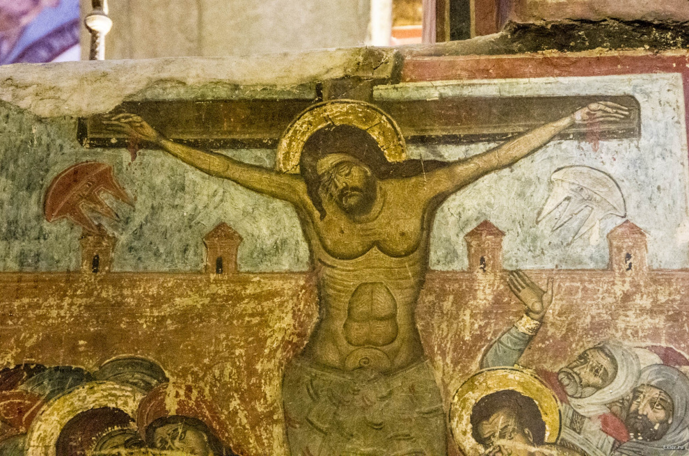 Фрески, которыми расписана башня. Обратите внимание, что слева-справа от распятия присутствуют то ли какие-то медузы с человеческими лицами, то ли летающие тарелки. Уфологи очень любят эту фреску - она часто встречается в уфологических изданиях.