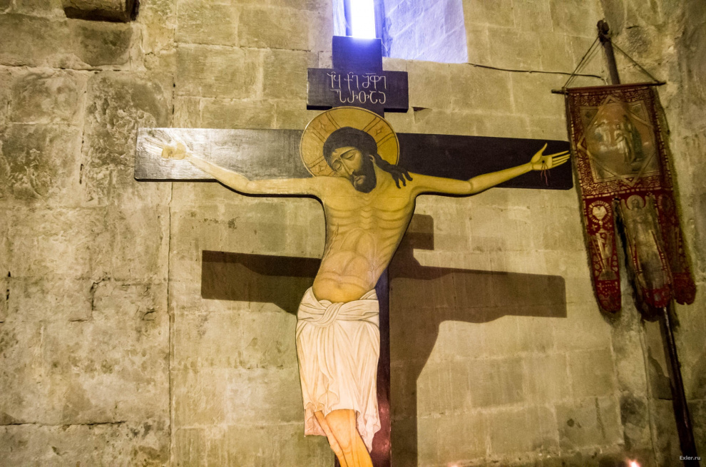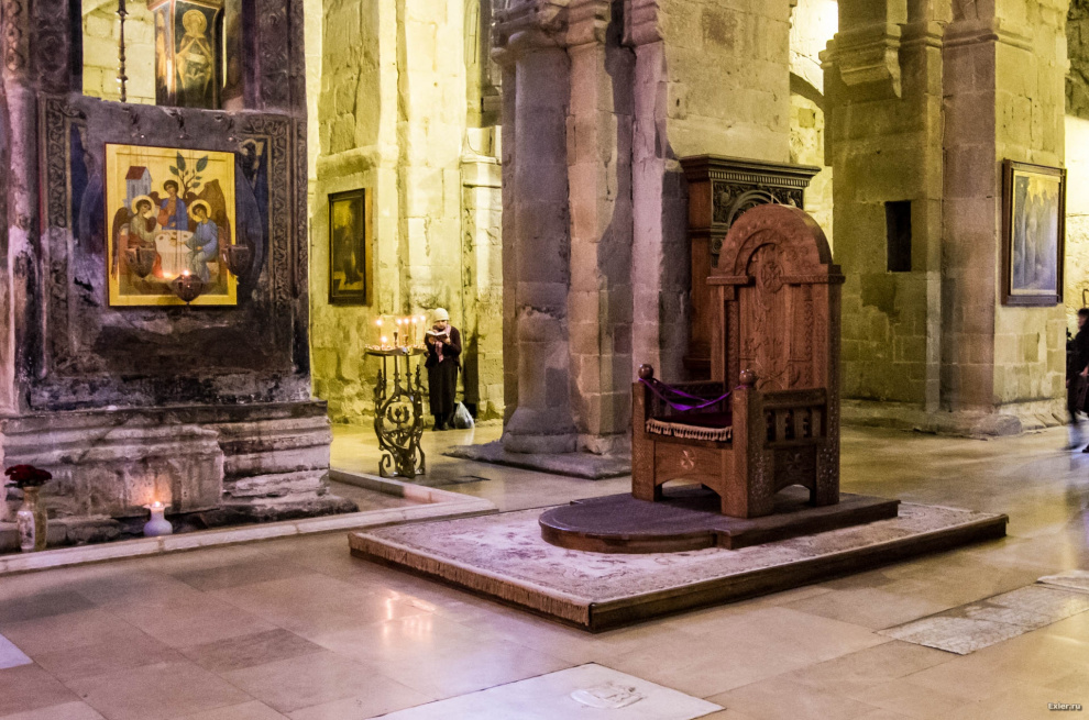 Первым христианским государем Грузии стал царь Мириан. Поначалу он, конечно, не был христианином, но когда в этих краях появилась святая Нина - она как раз приехала на могилу Сидонии, поклониться хитону Иисуса, - то сначала жена Мириана Нана крестилась, а потом и самого Мириана святая Нина обратила в христианство. И Мириан по совету Нины на месте захоронения Сидонии решил воздвигнуть храм. Тот самый кедр срубили, из него сделали семь колонн, шесть из которых благополучно установилили, а седьмая колонна вдруг повисла в воздухе.