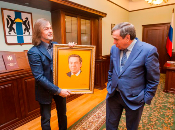 На фото - владелец принтера Никас Сафронов дарит губернатору Новосибирской области портрет губернатора Новосибирской области. Причем на этот раз Сафронов вообще ни разу перенапрягаться не стал: взял официальный портрет, залил его к гребеням в "Фотошопе" заливкой цвета детской неожиданности, ну и так и распечатал. Я бы, конечно, это убожество постеснялся бы вручать даже двадцатому помощнику младшего помощника депутата какого-нибудь зажопинского заксобрания, но Никас-то понаглее меня будет, ясный пень, поэтому и не постеснялся.