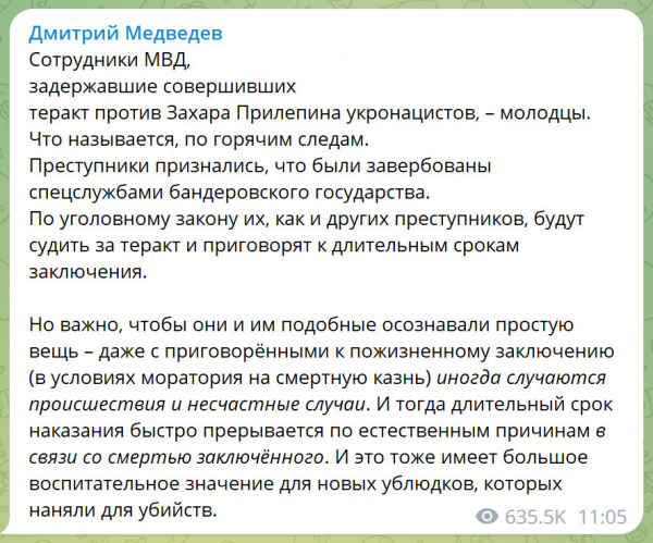 Юрист по образованию, зампредседателя Совета безопасности России Дмитрий Медведев в своем телеграм-канале угрожает внесудебной казнью в тюрьме людям, которые якобы причастны к покушению на Захара Прилепина. Мило, очень мило. А что - гуляй, рванина, чего стесняться-то?