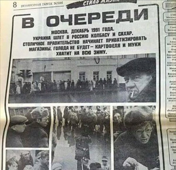 Я ехал осенью 1993 года из Калининграда в Харьков, и в Киеве между самолетом и поездом у меня была пара часов. Помню, зашел в гастроном где-то в центре и был поражен тем, что еды в продаже практически не было, а полки были заполнены 3-литровыми банками соков. Впрочем, у нас было примерно то же самое, но на 1-2 года раньше.
