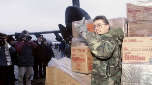 А кроме помощи в 90-е было ещё следующее:1) Россия. Голод 1891-1892 годов (знаменитые картины Айвазовского про американскую помощь).2) Советский Союз. Голод в Поволжье в 1920-е. (программа ARA, которая была организована Гувером по просьбе Горького и спасла миллионы голодающих).3) Продовольствие по лендлизу во время Второй Мировой (одних мясных консервов 2 млрд. банок, почти в 5 раз больше, чем СССР произвёл сам).Гуманитарная помощь Америки голодающей России