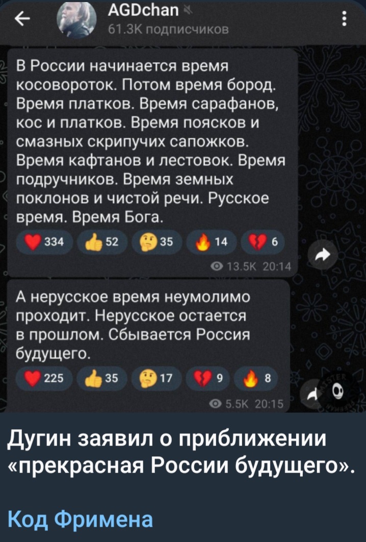 Малофеев, комментируя назначение Дугина, радуется тому, что теперь в Рассеюшке можно будет покончить с западной системой ценностей, а российские научно-образовательные парадигмы будут приведены к тому самому густопопсовому православному фашизму, то есть тому, что они называют "традиционными российскими духовно-нравственными ценностями",