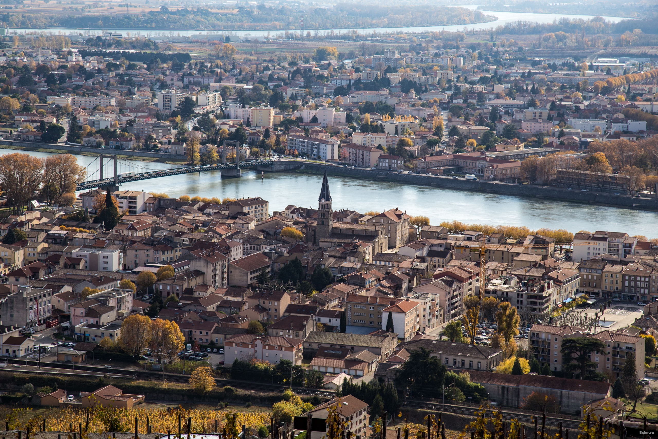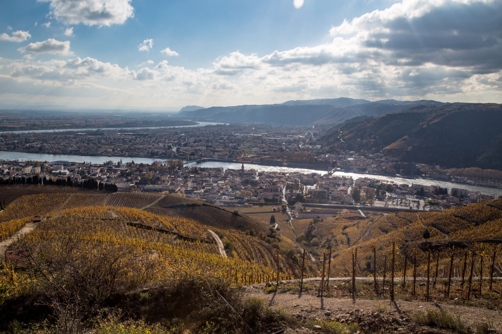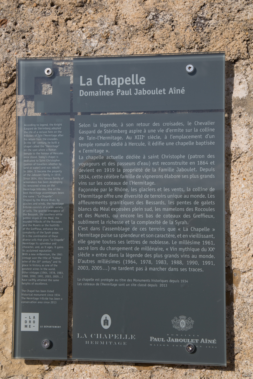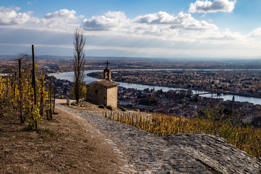 Ехали мы с Денисом Руденко из Бургундии в Испанию и посматривали по карте, куда бы нам заехать по дороге, но только чтобы надолго не зависать, а то до дома ехать было 900 километров. Шатонёф-дю-Пап был, в общем-то, недалеко, но до него надо было пилить километров двадцать в сторону, так что решили не заезжать. А потом Руденко выяснил, что у нас практически по пути - легендарный холм Эрмитаж, знаменитейший аппелласьон долины Роны. Фактически - винная Мекка. И что если мы туда не заедем, сказал Руденко, то потом никогда себе не простим. А так как съезд с трассы для посещения холма Эрмитаж занял у нас буквально десять минут, мы могли потратить часик на то, чтобы полазить по этому святому месту и пофотографировать.
