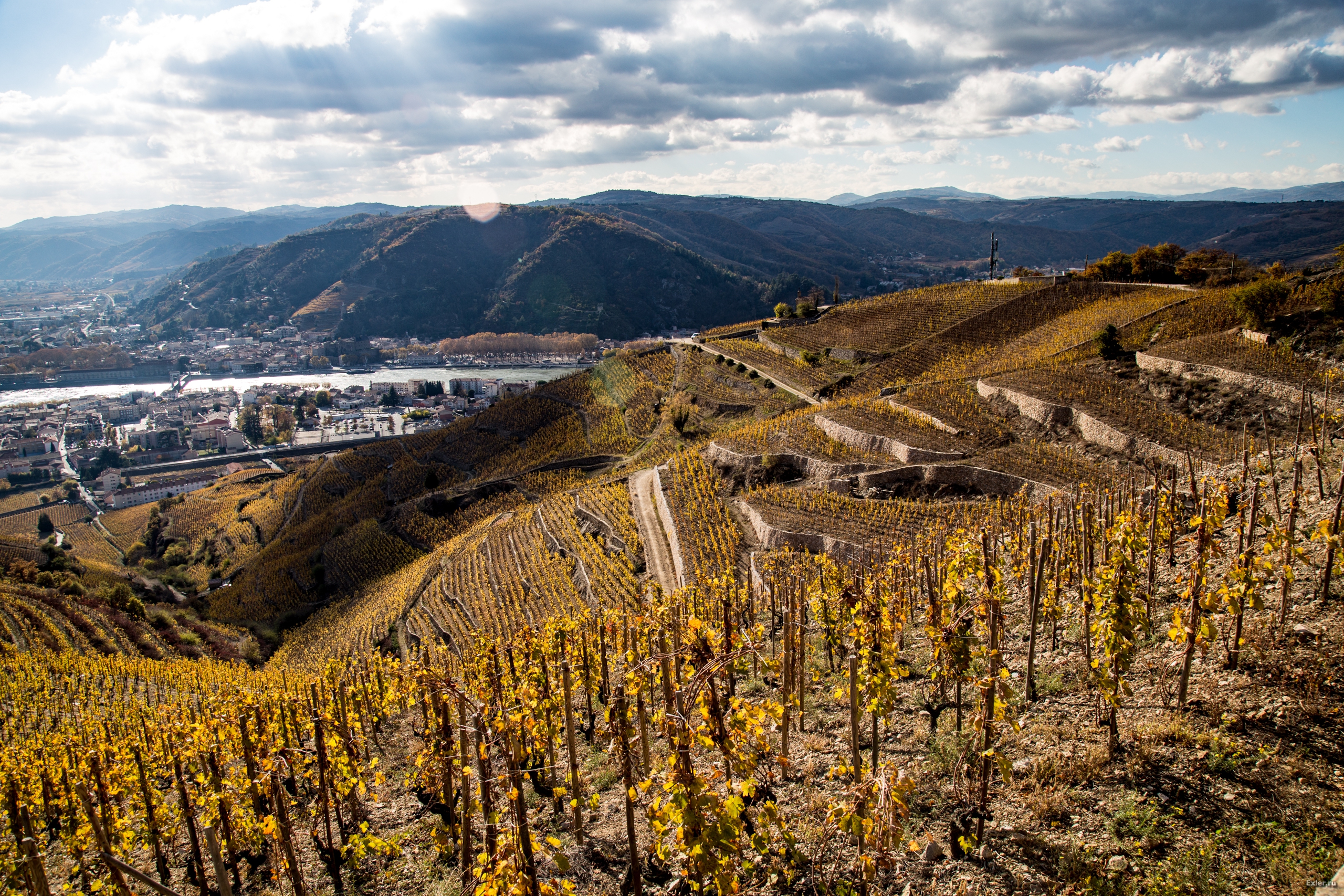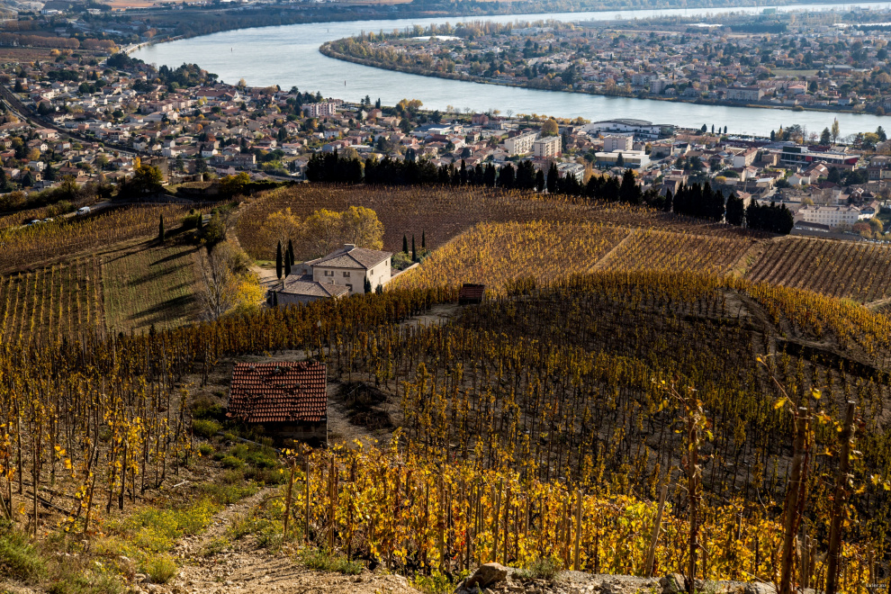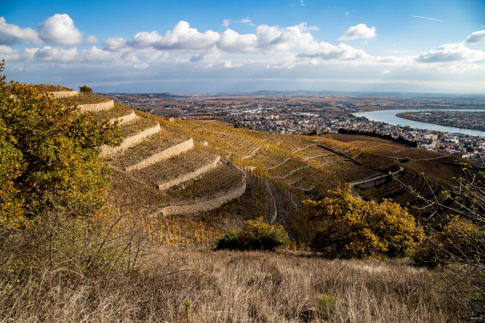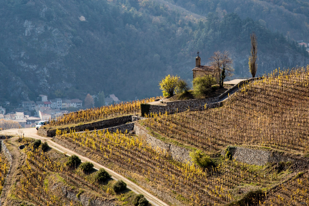 Ехали мы с Денисом Руденко из Бургундии в Испанию и посматривали по карте, куда бы нам заехать по дороге, но только чтобы надолго не зависать, а то до дома ехать было 900 километров. Шатонёф-дю-Пап был, в общем-то, недалеко, но до него надо было пилить километров двадцать в сторону, так что решили не заезжать. А потом Руденко выяснил, что у нас практически по пути - легендарный холм Эрмитаж, знаменитейший аппелласьон долины Роны. Фактически - винная Мекка. И что если мы туда не заедем, сказал Руденко, то потом никогда себе не простим. А так как съезд с трассы для посещения холма Эрмитаж занял у нас буквально десять минут, мы могли потратить часик на то, чтобы полазить по этому святому месту и пофотографировать.
