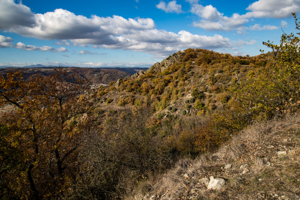 Сначала мы туда заехали на машине на самый верх - со стороны северного склона, который весь зарос лесами: на нем выращивать виноград не имеет никакого смысла. Внизу течет Рона.
