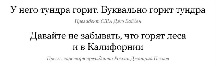 "А они (Китай - ИФ) устранились. То же касается и Путина, России. Тундра горит, действительно горит. У них серьезная климатическая проблема, а они молчат, когда речь заходит о том, чтобы что-то с этим делать", - отметил он. (Отсюда.)