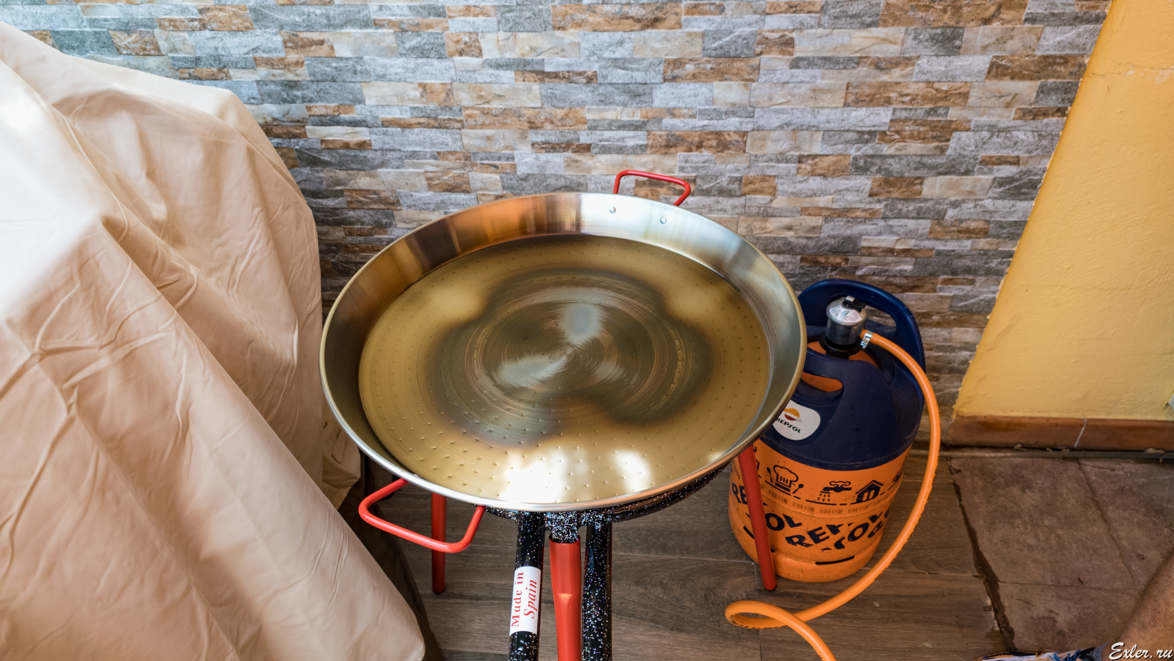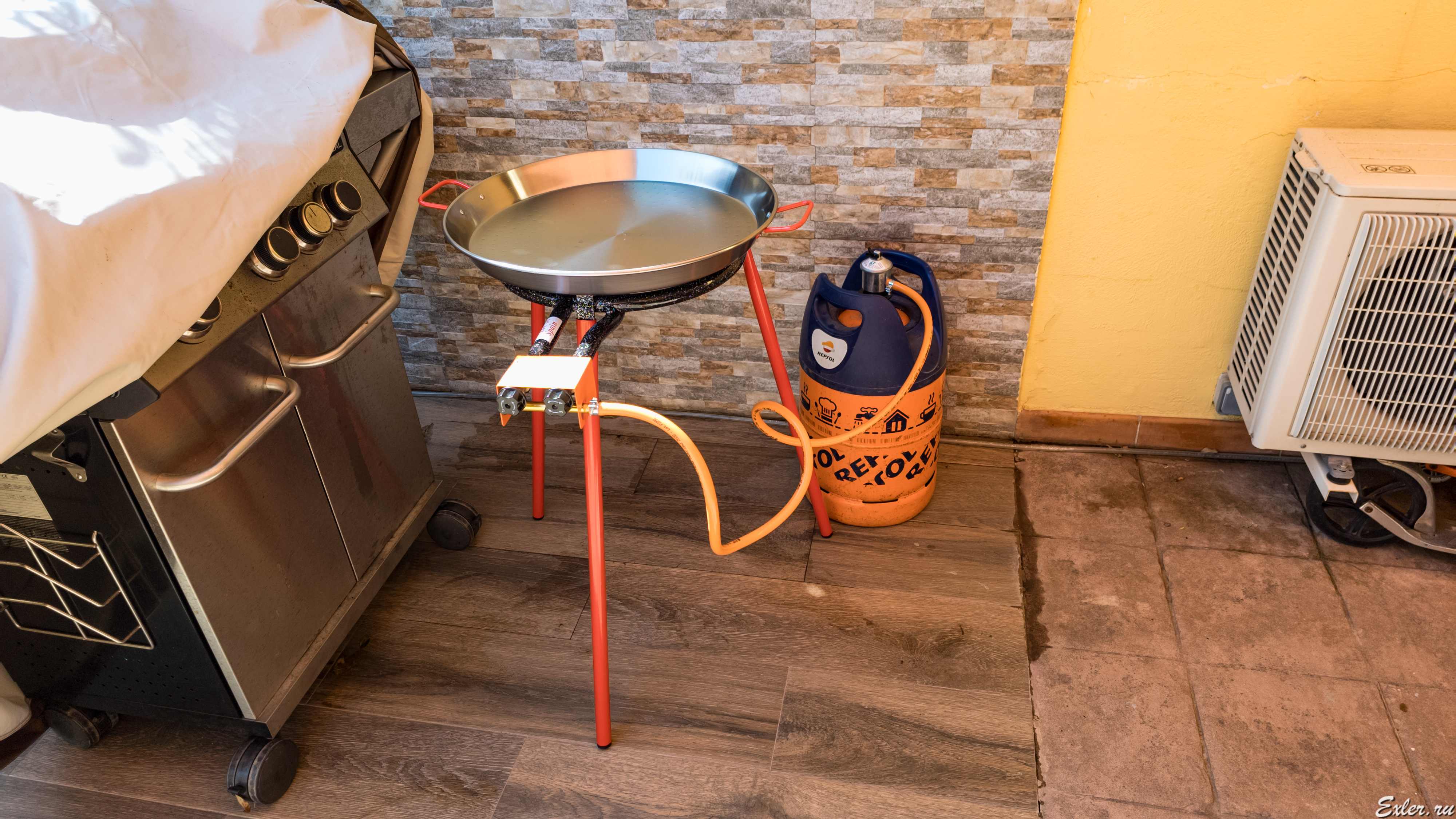 Купил я себе 50-сантиметровую паэльеру с соответствующей газовой горелкой. Оно, конечно, по классике надо готовить на дровах из апельсинового дерева, но у меня нет достаточного опыта регулирования температуры при готовке на дровах/углях, поэтому двухзонная газовая горелка - самое то что надо!
