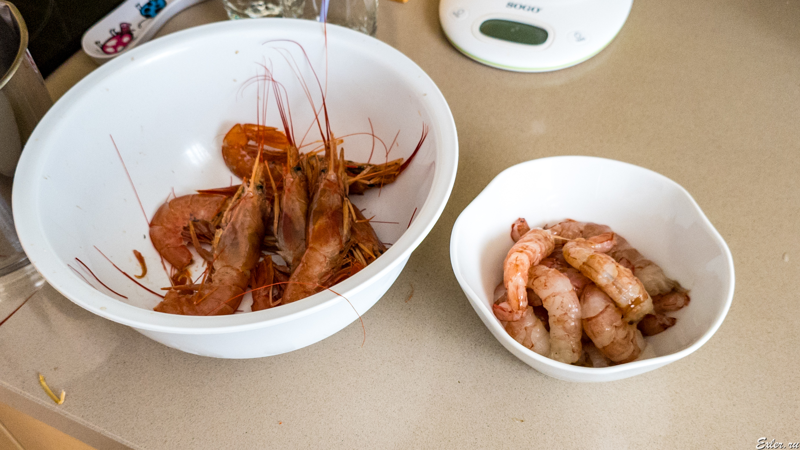 Влад предпочитает в паэлью класть очищенные креветки: большую часть почистили, оставили шесть штук нечищеных - для правильного вида паэльи.