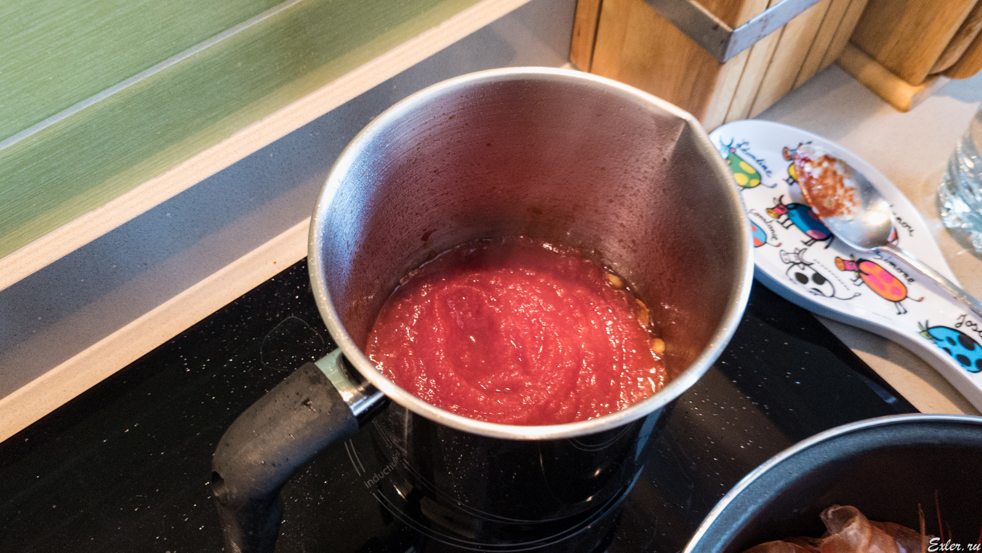 Отдельно делаем соус. Мелко порезанные три дольки чеснока сначала слегка поджариваются в оливковом масле, потом заливаются растертыми томатами и туда добавляется ньора.