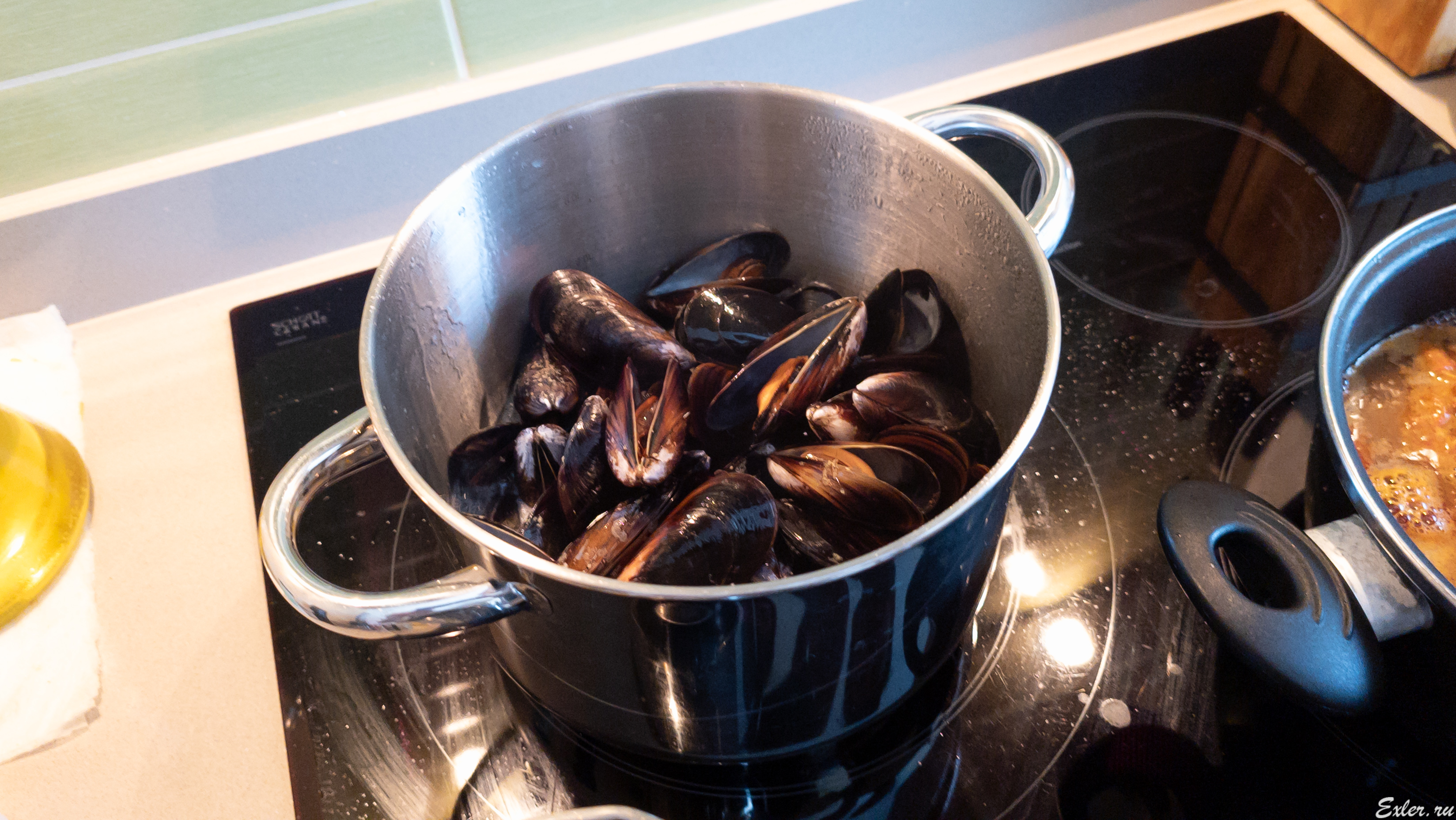 Эти мидии надо перед готовкой помыть/почистить. (Есть другой вид, с которыми ничего не надо делать.)