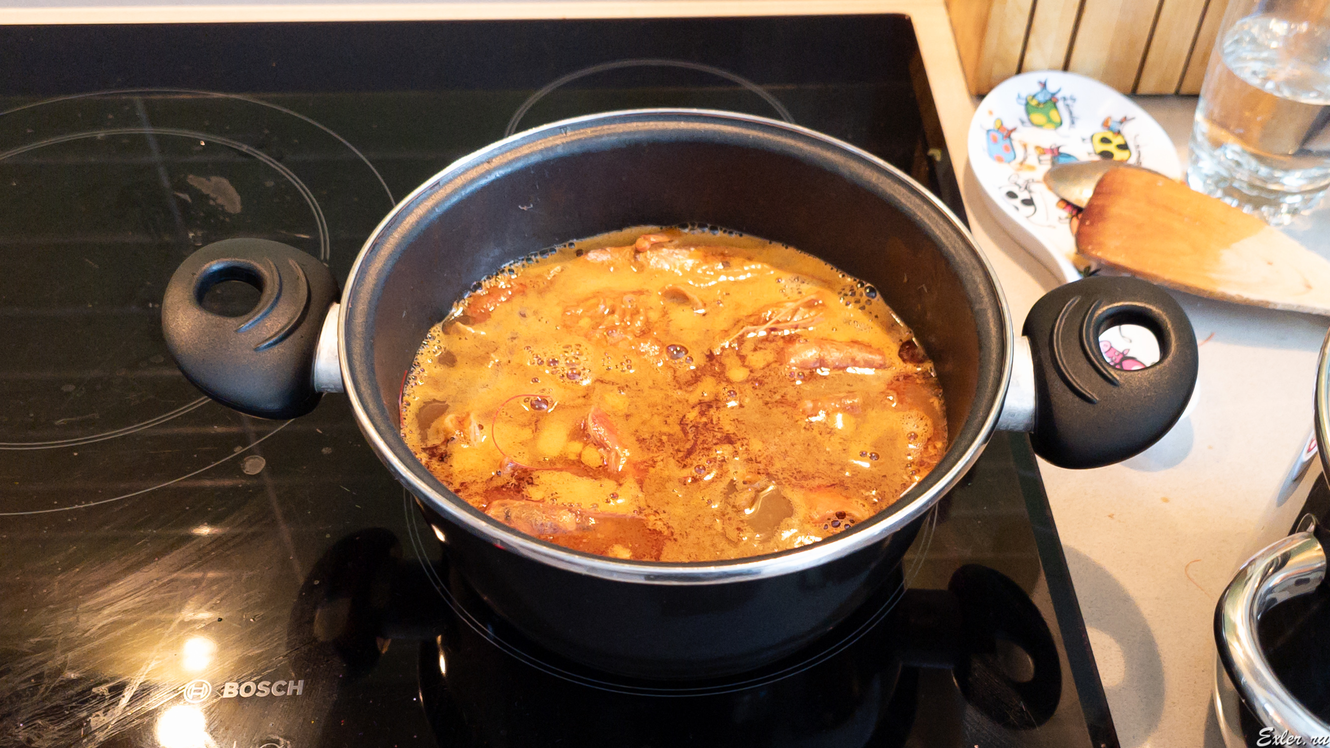 Заливаем горячим бульоном через дуршлаг. Бульон должен находиться на уровне примерно 5 миллиметров от дна сковородки.