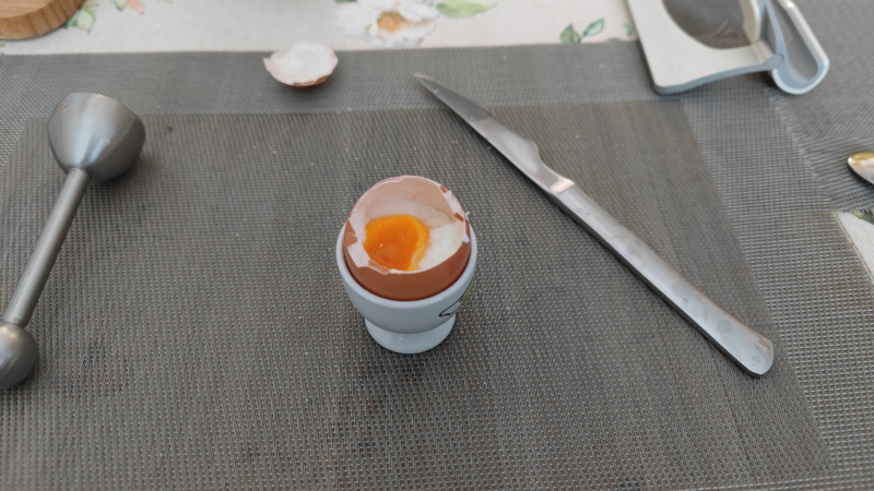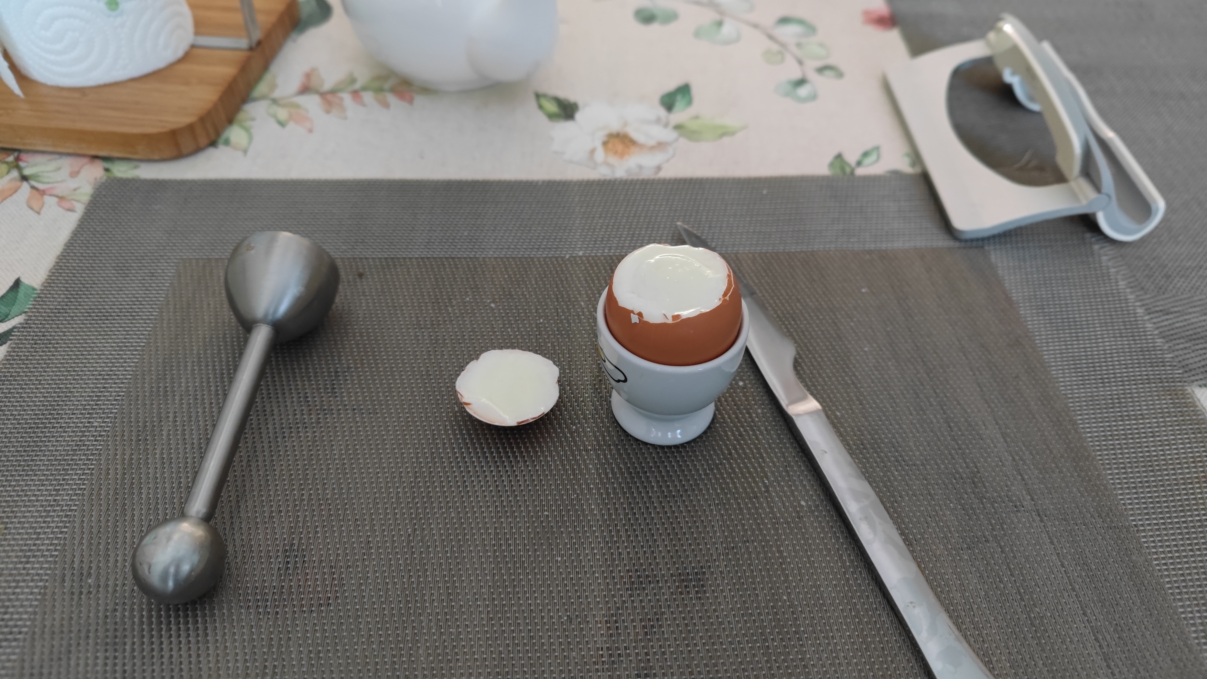 Достал родимый айершаллензолльбрухштелленферурзахер, надбил скорлупу, срезал крышечку. Белок сразу не понравился - слишком жидкий. Попробовал - на вкус как крем. Прикольно, но невкусно, белок должен быть более или менее твердый.