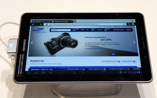 А это Samsung Galaxy Tab 7.7 Вроде почти точная копия Galaxy Tab 10.1, только в варианте семидюймового планшета. Значит, машинка интересная. Также любопытно, сколько она живет от батареи - на стенде не сказали.