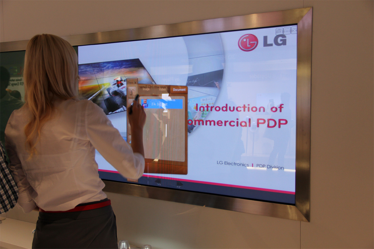 Также на стенде LG демонстрировали всякие сенсорные смарт-технологии на экране здоровенной панели. Смотрелось эффектно.