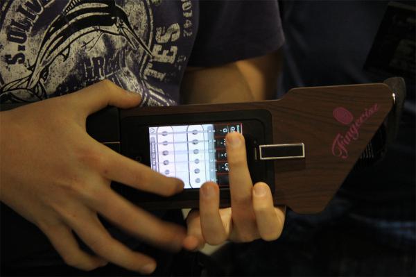Устройство, превращающее айфон в электрогитару. Парнишка-посетитель, кстати, на ней классно сыграл вступление к Smoke on the water.