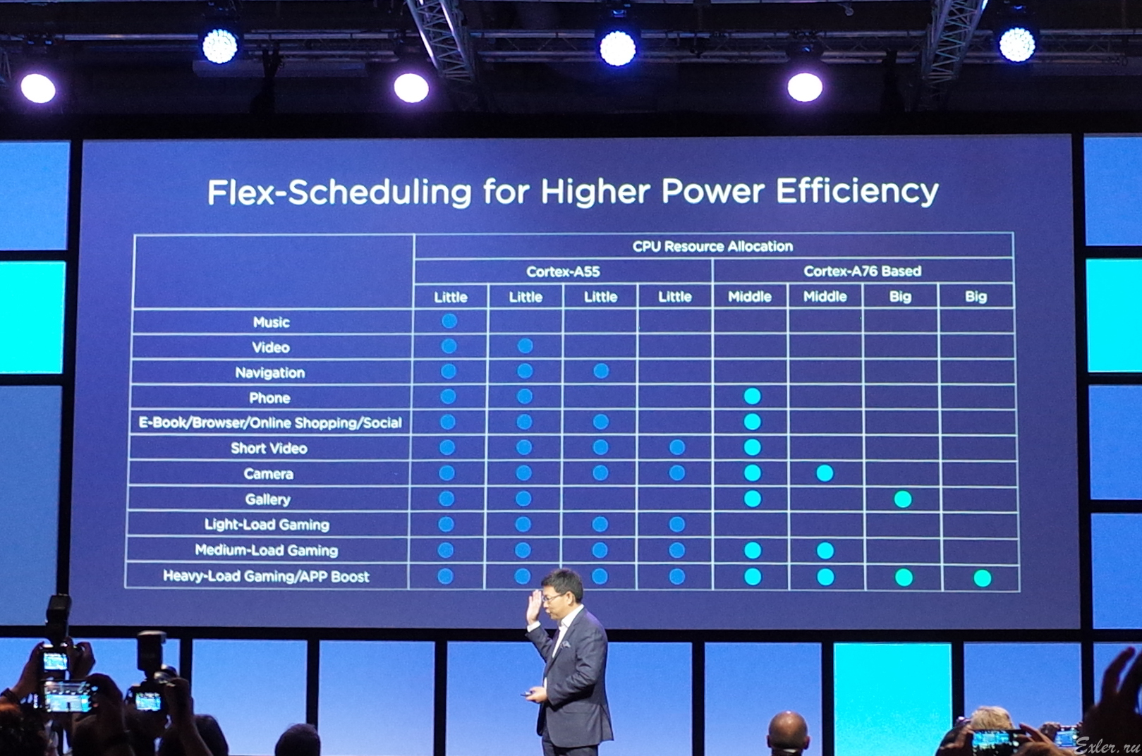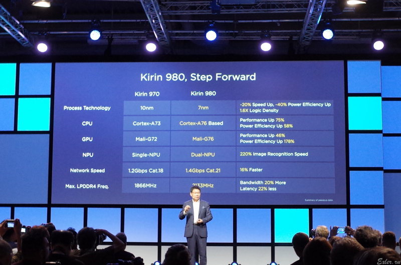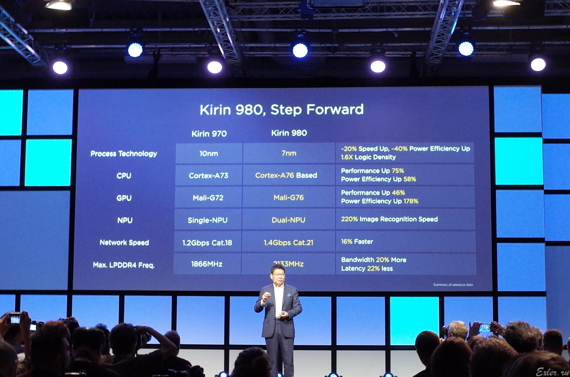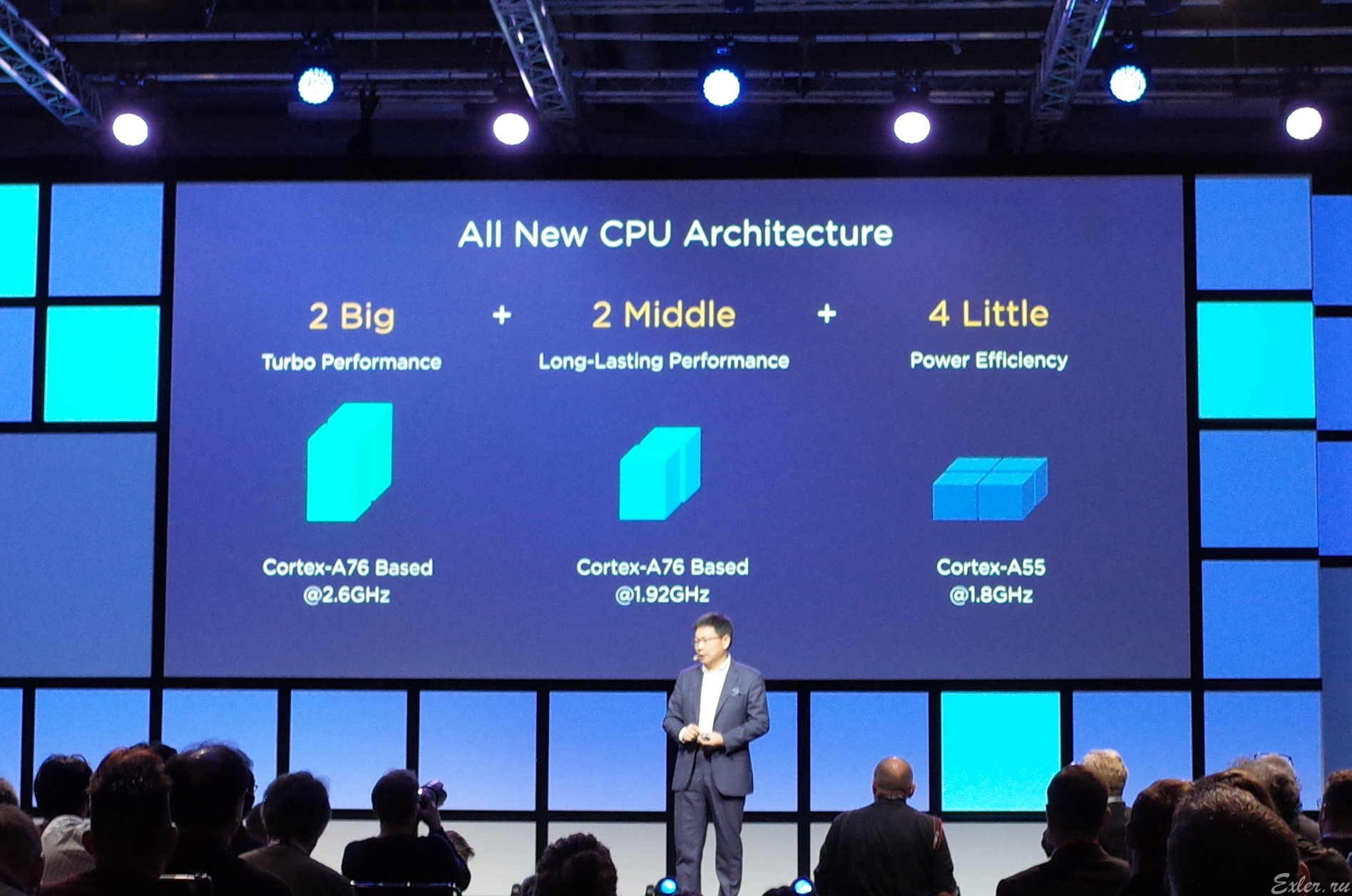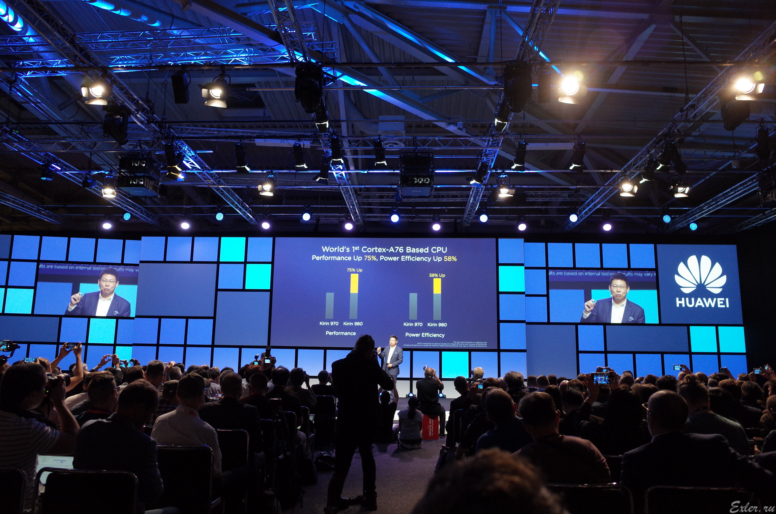 На презентации показали кучу всяких диаграмм, из которых следовало, что на данный момент это самая-рассамая крутейшая мобильная платформа в мире. По сравнению с Kirin 970 производительность увеличилась на 75%, а энергоэффективность - на 58%.