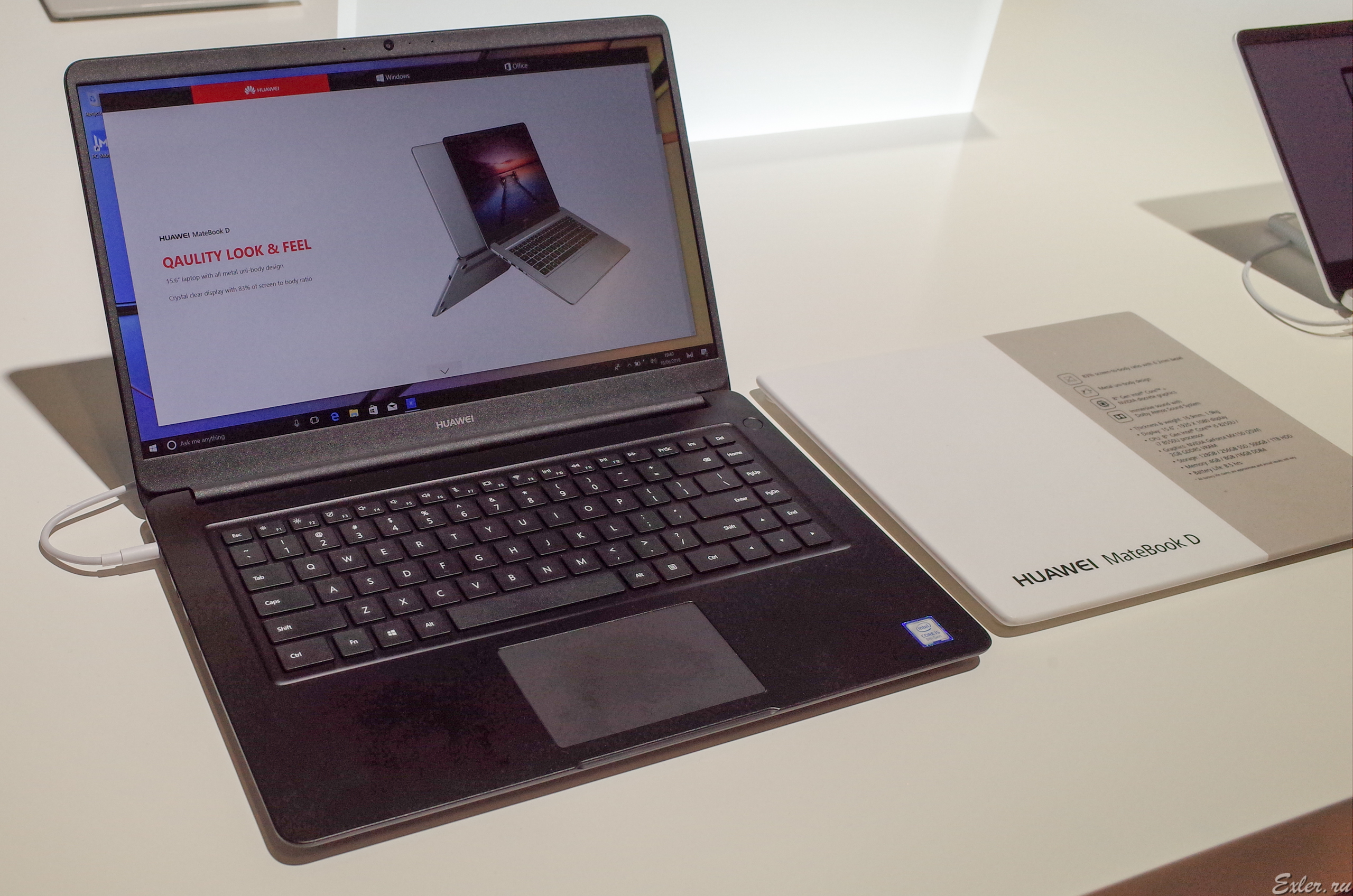 Huawei MateBook D. Первый MateBook был трансформером и явно косил под MS Surface, а MateBook D - обычный честный ультрабук. Дисплей 15,6" IPS FullHD, вес 1,9 кг, процессор Intel Core i5 или i7, память 4-8-16, диск 128-256 SSD или 1 ГБ HDD. Wi-Fi 802.11ac два диапазона. Аккумулятор 3800 мАч (вот это что-то маловато, на мой взгляд). Ничего выдающегося, обычная рабочая лошадка.